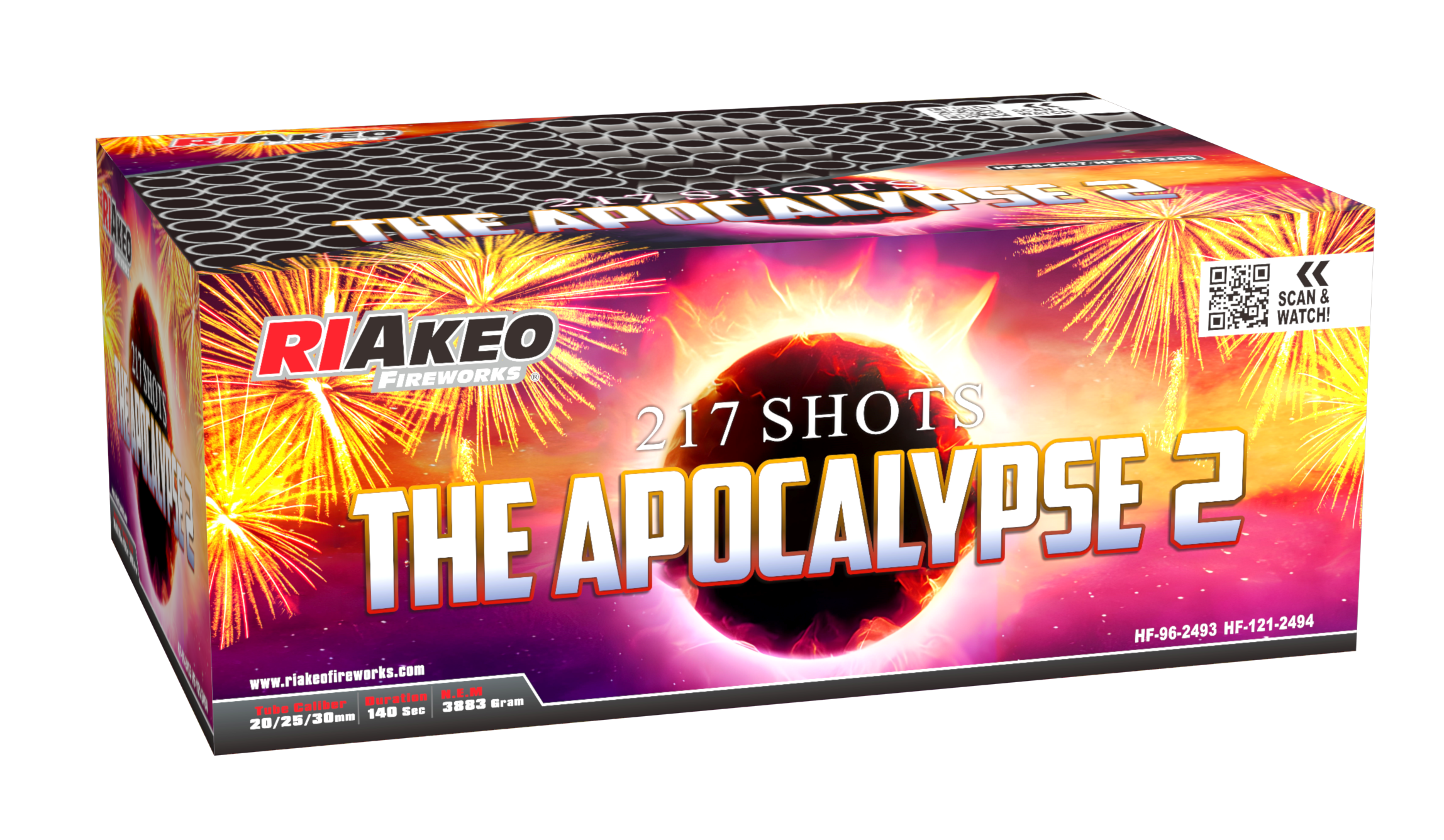 Mit dem Verbundfeuerwerk The Apocalypse 1+ 2 liefert Riakeo ein monumentales Feuerwerkserlebnis, das keine Wünsche offenlässt. Vier perfekt aufeinander abgestimmte Verbunde entfesseln in knapp zwei Minuten eine brachiale Pyro-Inszenierung von 409 Schuss mit abwechslungsreichen Farben, Formen und Klanggewalten.