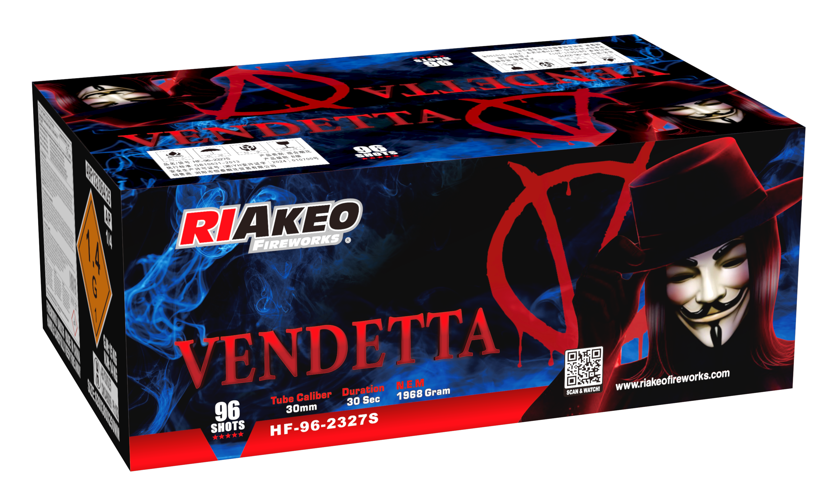 Die Riakeo Vendetta ist ein beeindruckendes Verbundfeuerwerk, das sich durch seine kraftvollen Effekte und schnelle Schussfolge auszeichnet. Mit 96 Schuss im Kaliber 30 mm und einer Nettoexplosivmasse (NEM) von etwa 1.968 g bietet sie eine intensive, etwa 30 Sekunden dauernde Show, die den Himmel mit goldenen Brokatkronen und lebendigen Farbsternen erfüllt.