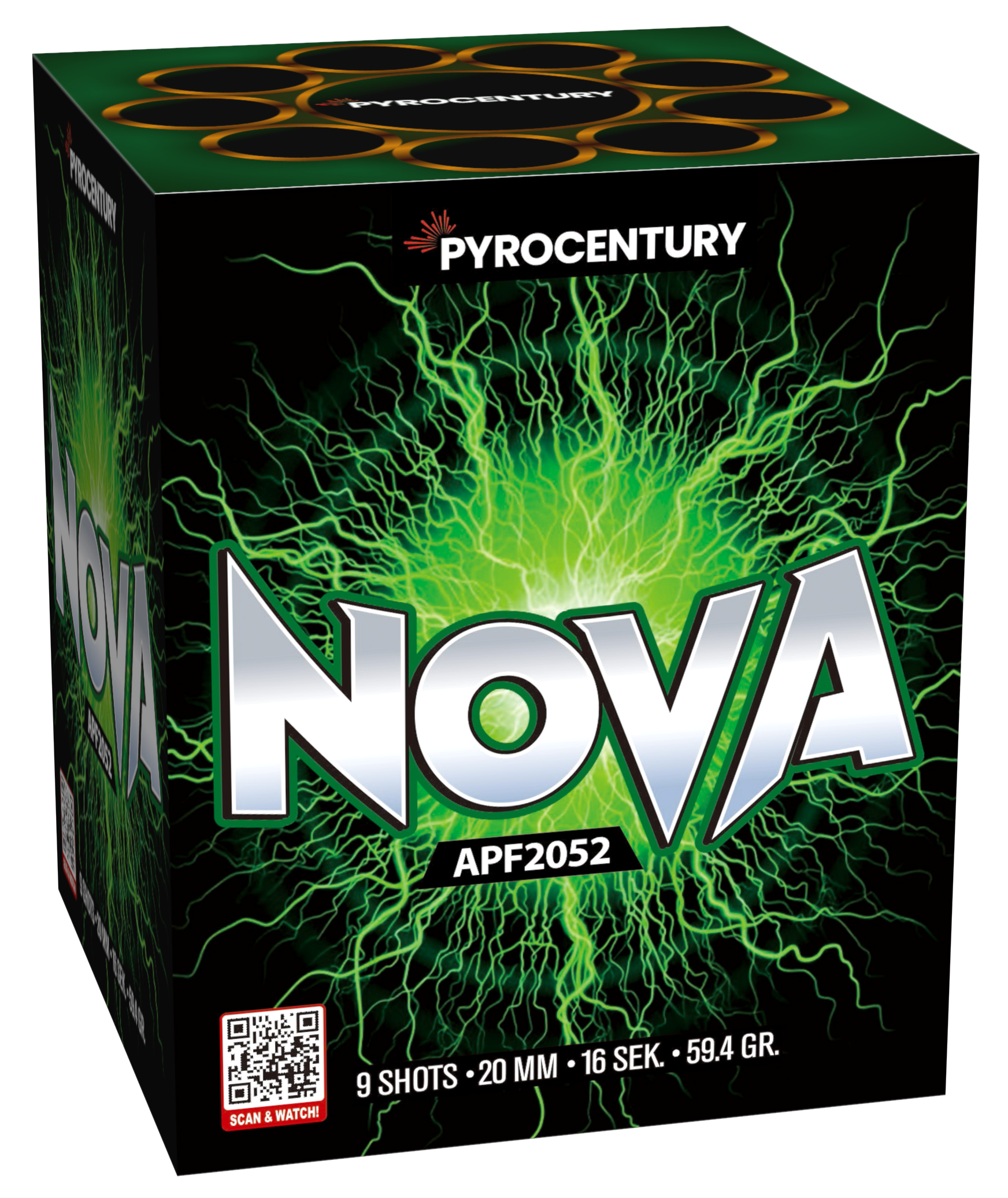 Die Pyrocentury NOVA liefert 9 Schuss im Kaliber 20 mm und beeindruckt mit edlem Nishiki-Gold, einem Effekt, der in dieser Preisklasse nur selten zu finden ist.